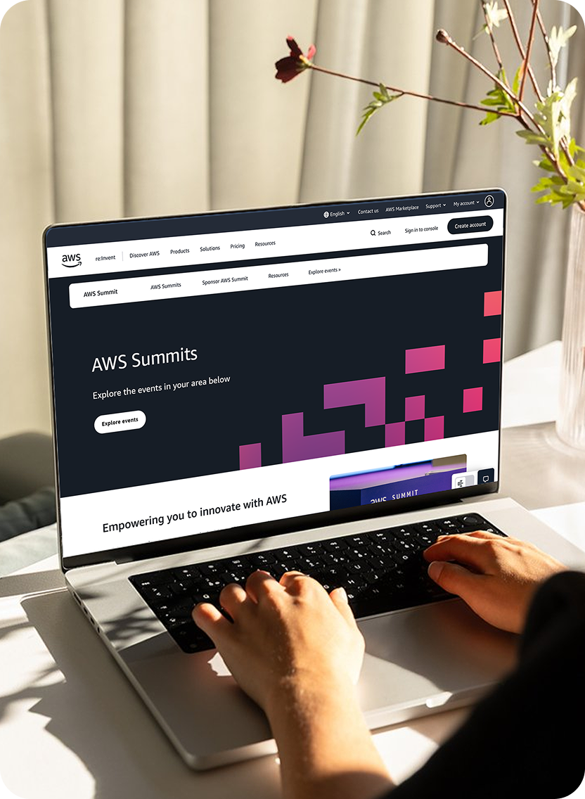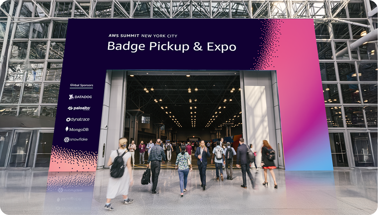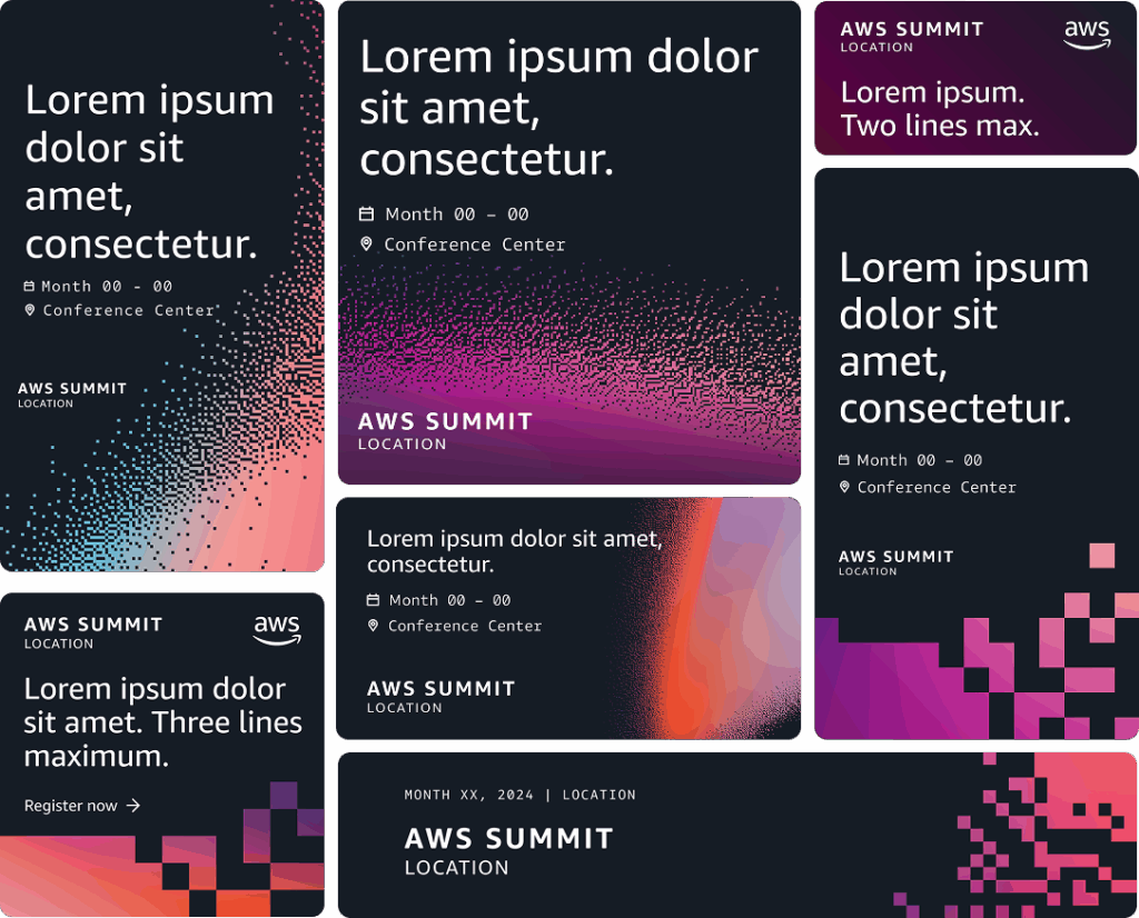 From there, the work was about making that idea hold at scale. Visual language, event marketing, on-site assets, and the systems that let distributed teams execute consistently across events of wildly different sizes and contexts. Signage, wayfinding, spatial design, copy, and motion — all threaded through a single design system with enough flexibility to stay local while feeling unmistakably AWS. Templates and automation tools cut production friction significantly, letting teams move faster without sacrificing quality. The goal was a global event identity that scales without flattening.
